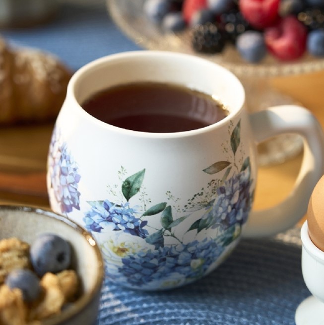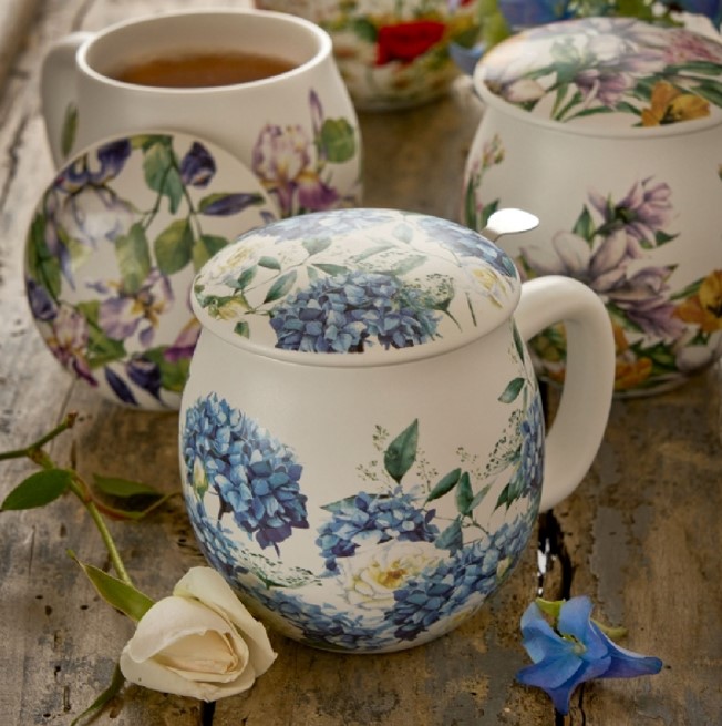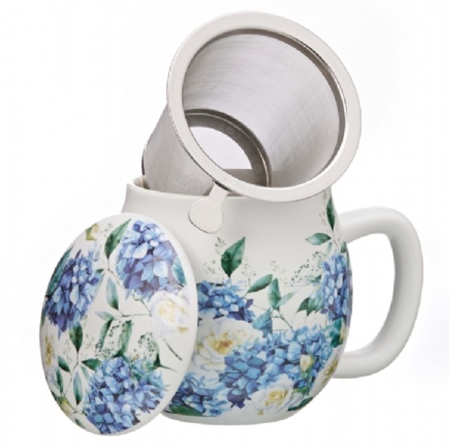 Porseleinen theemok met exclusief La Via del Tè Bouquet bloemenpatroon Hortensia (350 cc) met deksel en roestvrijstalen zeef, ideaal om snel je favoriete thee te bereiden.