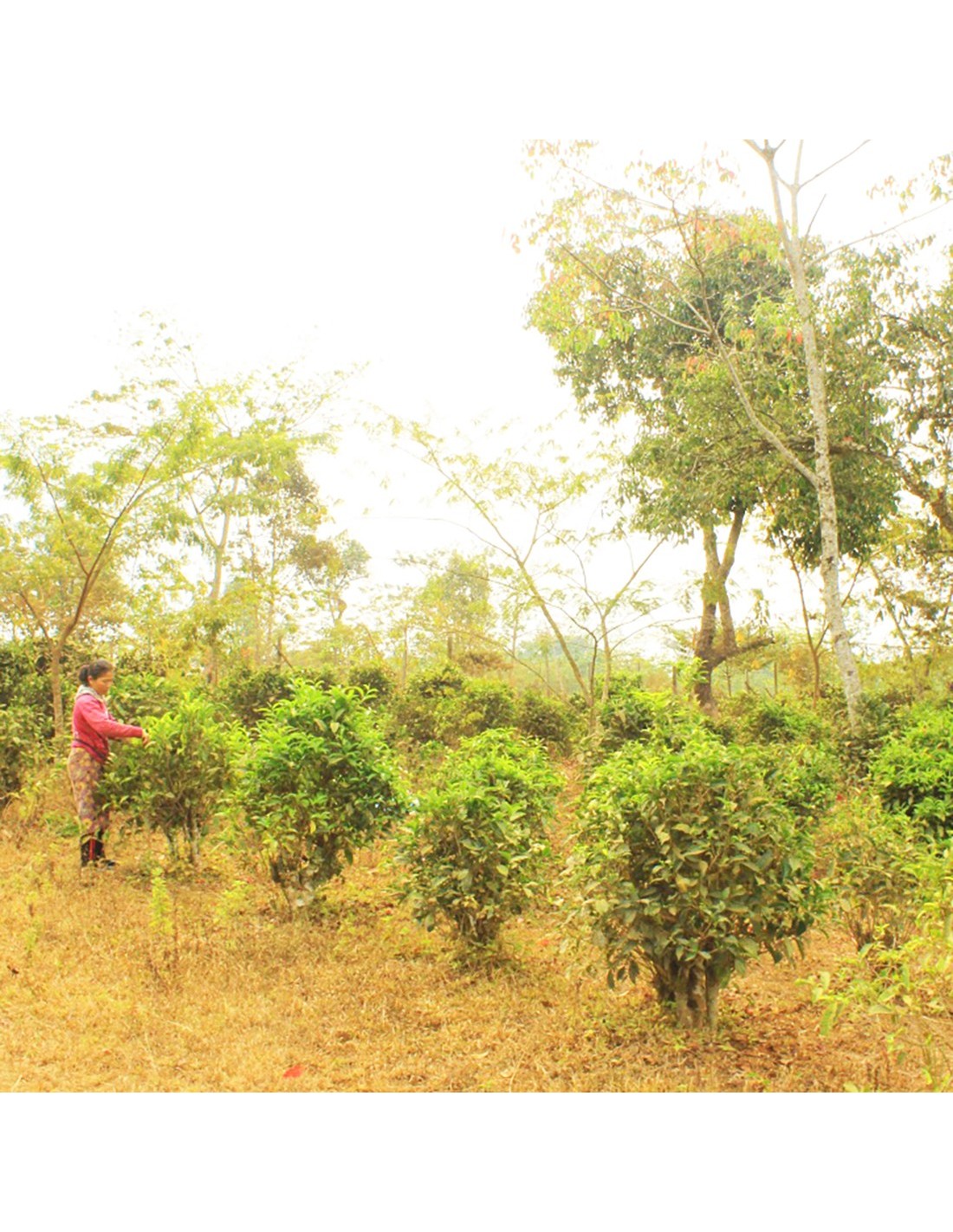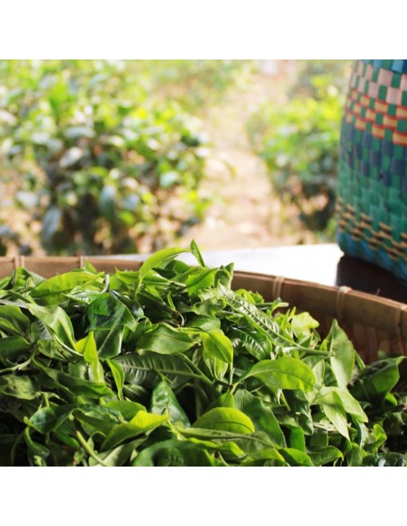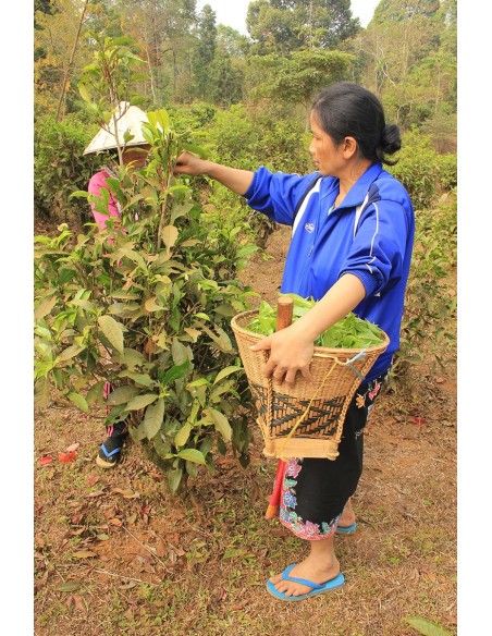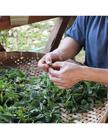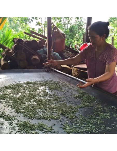 Deze thee wordt geproduceerd door mevrouw Bua Li Lam met de theebomen uit haar tuin die ze kweekt in haar dorp op 1.000 meter boven zeeniveau op het Boloven Plateau in het zuiden van Laos. De theeplanten werden in de jaren 30 door de Fransen in Indochina geplant. Om haar thee te drogen, gebruikt mevrouw Bua een wok die ze verhit met hout dat ze uit de jungle heeft gehaald. De thee ondergaat een lichte fermentatie en wordt ook licht gerookt na de passage in de wok.