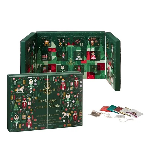 Adventskalender met een selectie van 24 stuks La Via del Tè thee en kruidenthee verpakt in enkelvoudig dosisfilters van katoenen mousseline (gemaakt van maïs). Een kostbaar geschenk waar alle theeliefhebbers blij van worden. Elke dag een andere thee of kruidenthee om te ontdekken en elke dag een andere thee-‘quote’, spreuk of een feit over thee.