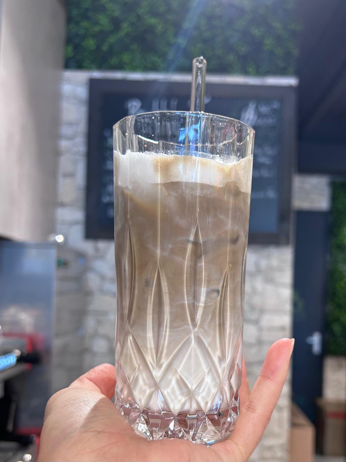 - Iced latte: 150ml koude (plantaardige) melk, ijsblokje en houjicha.